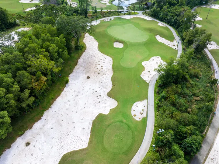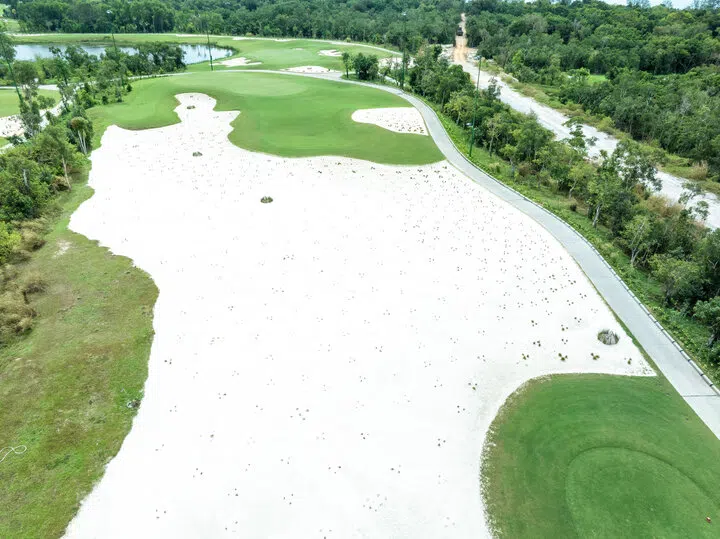 Waste bunker được bố trí dọc 2 bên fairway, tập trung nhiều bên phải khu vực green, tạo điểm nhấn và tăng độ thử thách cho người chơi.